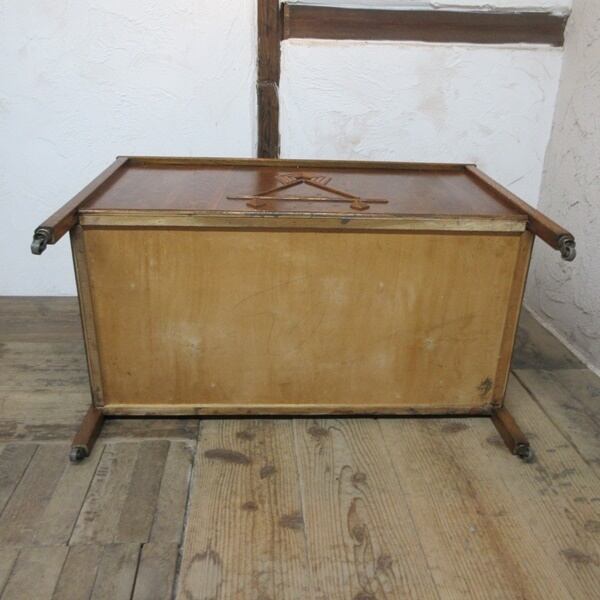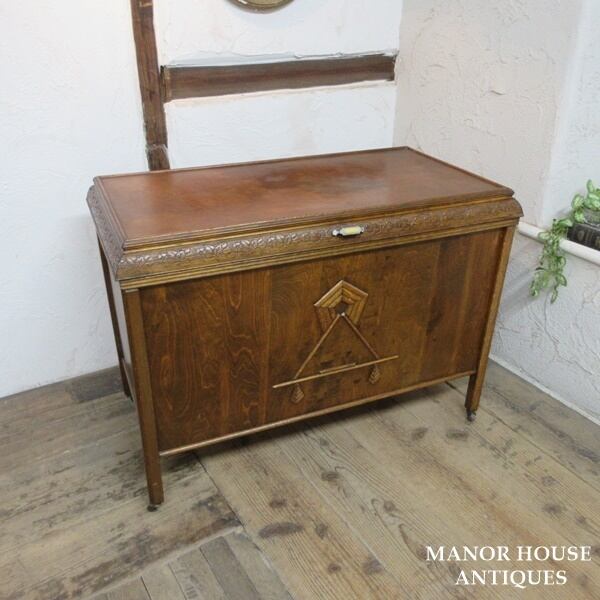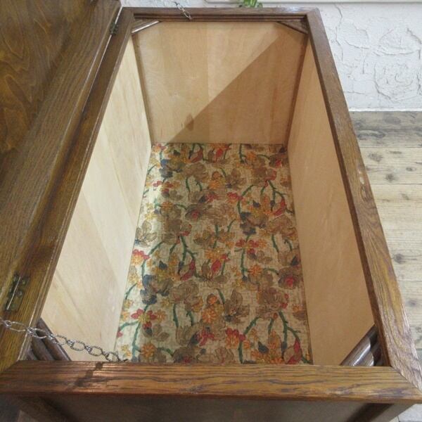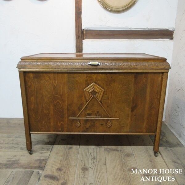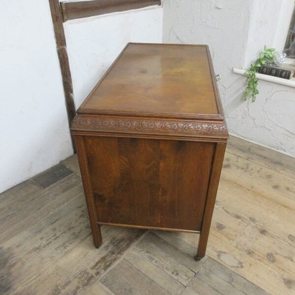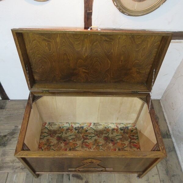 キャスター付きのブランケットボックス。天板周囲の彫りが可愛らしく、正面の飾り木も印象的なお品です。