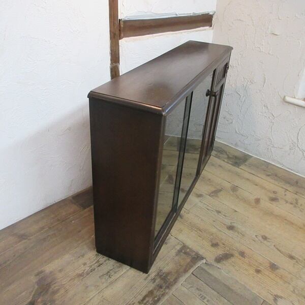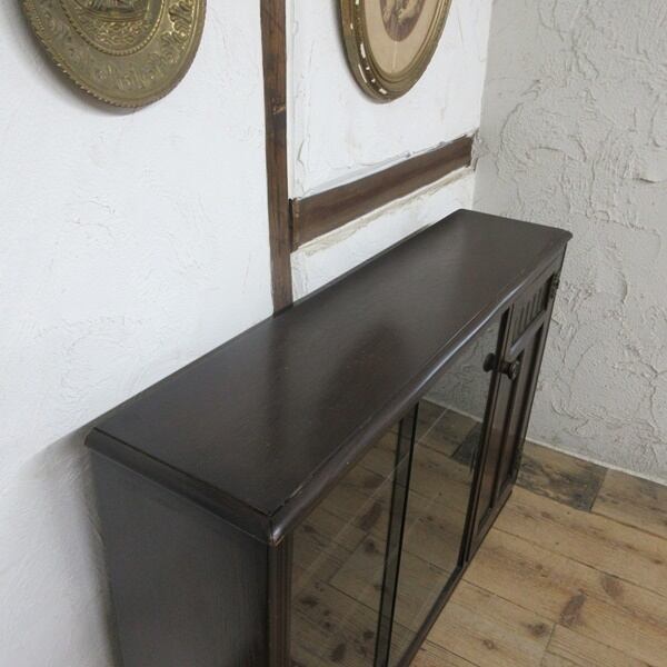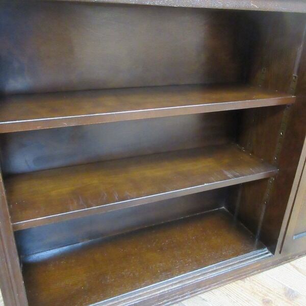 ガラス引き戸タイプのブックケースに扉の収納が付いた便利なお品です。落ち着いた色味とデザインで和室にも合いそうですね。