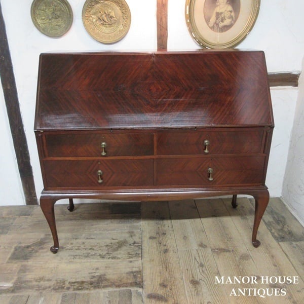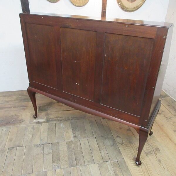 赤みを帯びたマホガニーのお色と猫脚のスタイルが美しいお品です。ワイドが広めのビューローですので、2人椅子を並べてお使いいただいても良いかも知れません。