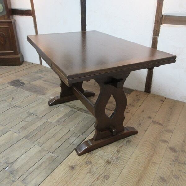 天板下に彫りの装飾が施された存在感のあるお品です。人数が増えた時はサイドの天板を引き出して拡張することができる便利なお品です。