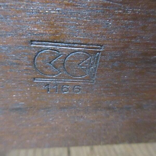 【CC41のマークについて】・・・皆さん、「CC41」についてご存じでしょうか?一見、「パックマン」のデザインが並んでいるように見えますね。「CC41」のCCとは、“Controlled Commodity”の略で、「CC41」は「統制商品」を意味しています。第二次世界大戦の影響による物資不足のため、イギリスにおいて出された倹約令のもとで、政府の緊縮財政規制の基準を満たしている商品に「CC41」の刻印またはラベル付けがされました。「CC41」のロゴは、1941年から1952年に撤廃されるまでの10年間ほど、衣類・履物・家具に表示され、簡単な分かりやすいマークで一般の人々はアイテムが非課税であるかどうかを知ることが出来ました。マークは、安く信頼性の高い商品を表すようになりました。