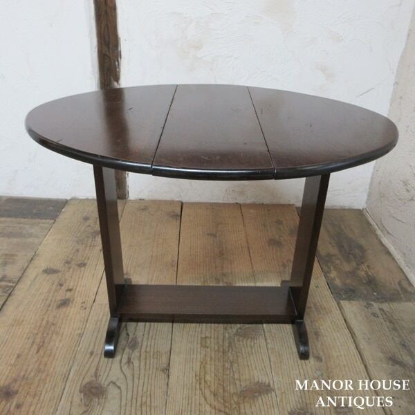 小さめサイズのサイドテーブル。バタフライ天板部分を持ち上げながら左に90度回転させてテーブルを広げる仕様となっております。コンパクトに収納できますが広げるとそこそこの広さがあり便利です。
