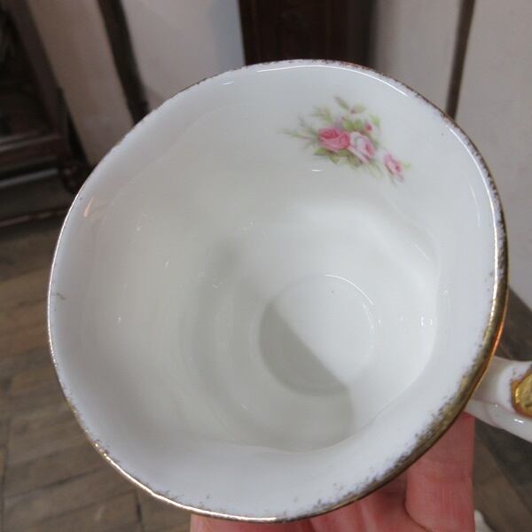 ぼかしの金彩とピンクのミニバラが華やかで心惹かれるお品です。ティーカップの形はスマートなエリザベザンシェイプです。