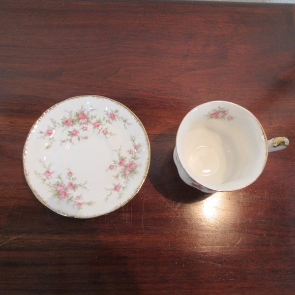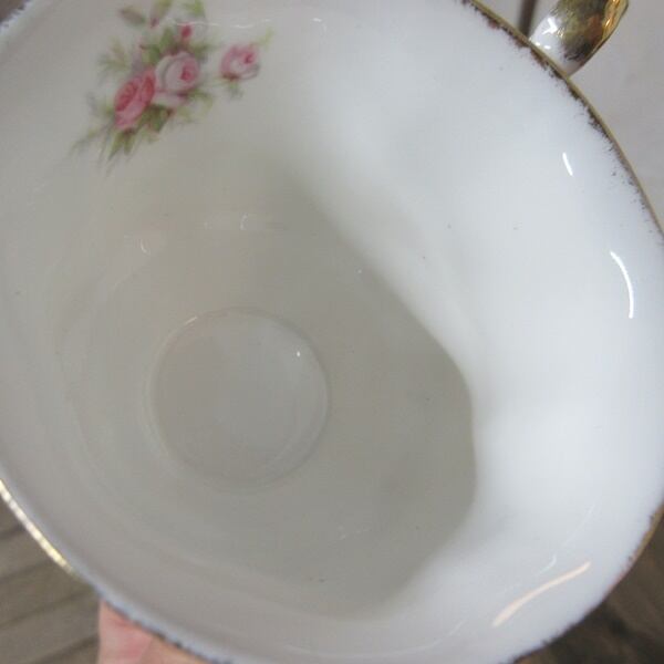 ぼかしの金彩とピンクのミニバラが華やかで心惹かれるお品です。ティーカップの形はスマートなエリザベザンシェイプです。