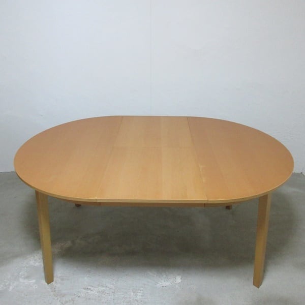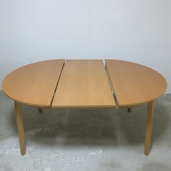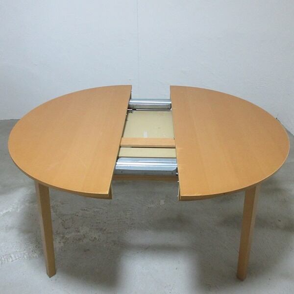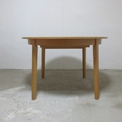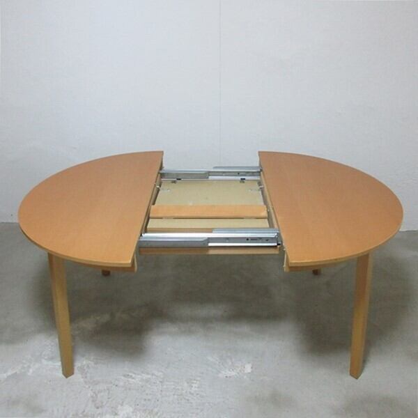 両サイドを引っ張って中央を広げ、内蔵されている天板を広げて拡張するタイプのエクステンションテーブルです。幕板のダボから入れるとスムーズに拡張できます。
