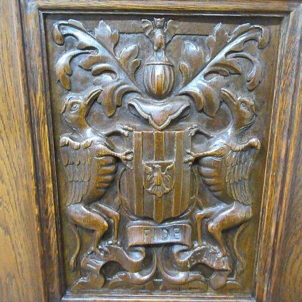 正面にはイギリスでは珍しい紋章の彫刻が施されており、ベルギーの地方都市メヘレン(Mechelen)の紋章のようです。リボンの所には“in fide constans”とあり、調べますとラテン語で「揺るぎない忠誠心」などという意味で使われているそうです。どういういきさつでイギリスの家具にこの紋章が使われたのか調べても出てきませんが、歴史的に何か関係があるのかも知れませんね。