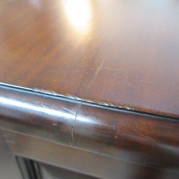 天板に反りがあり、天板下に少し隙間がある部分がございます。また、天板にヒビ・書き込みキズ・キズ・凹みキズ・染みがございます。