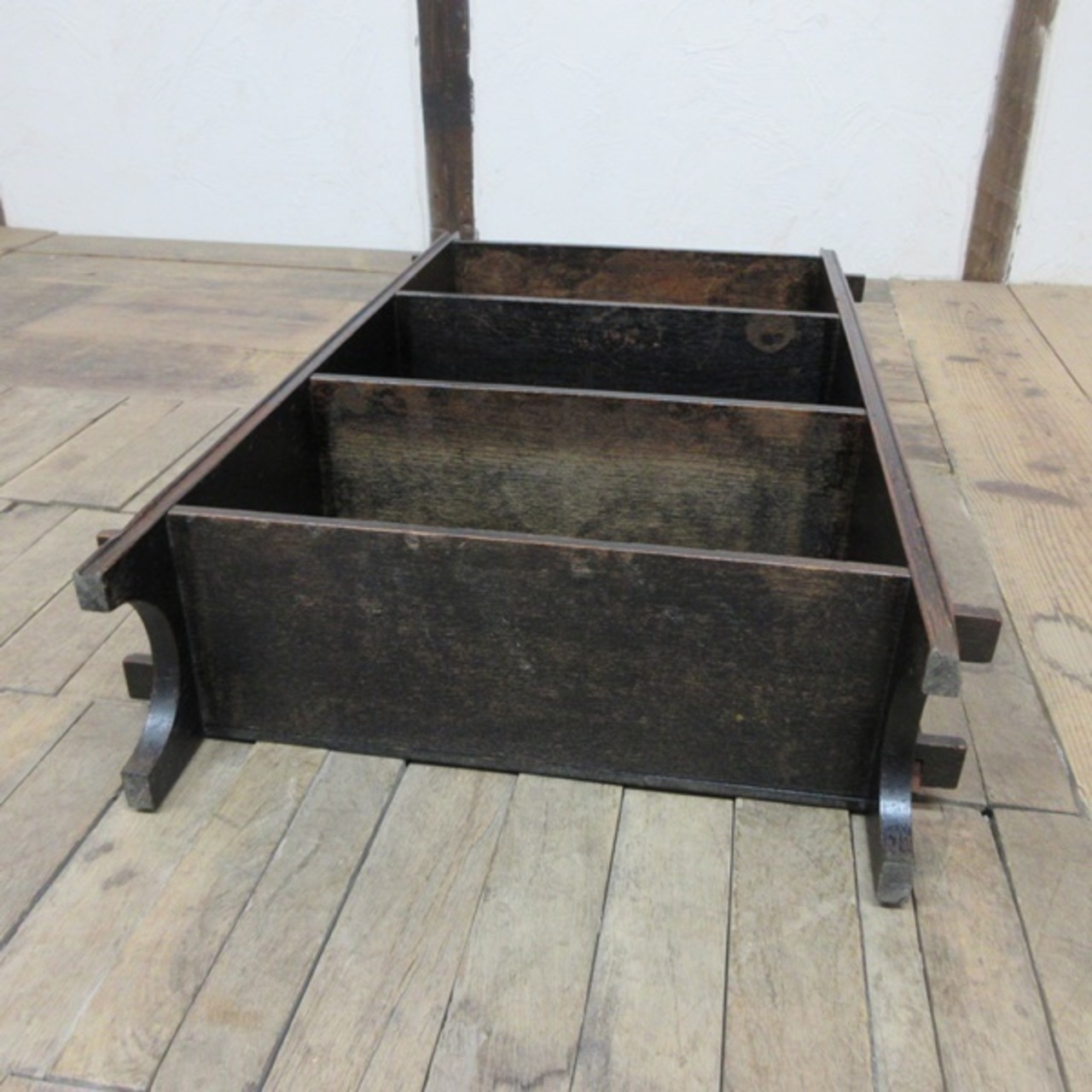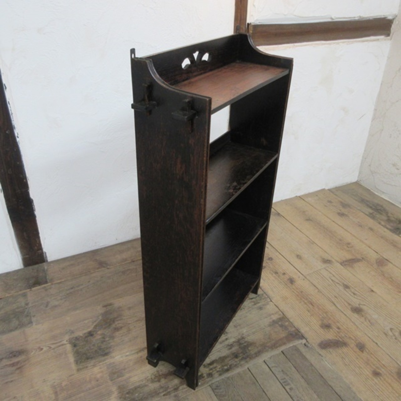上段棚の背面板が欠損しておりましたので、こちらで取り付け補修いたしました。その際に接着剤を使用いたしましたので、本来くさびを外すと全体的にばらせる仕様でしたがばらすことは出来ません。