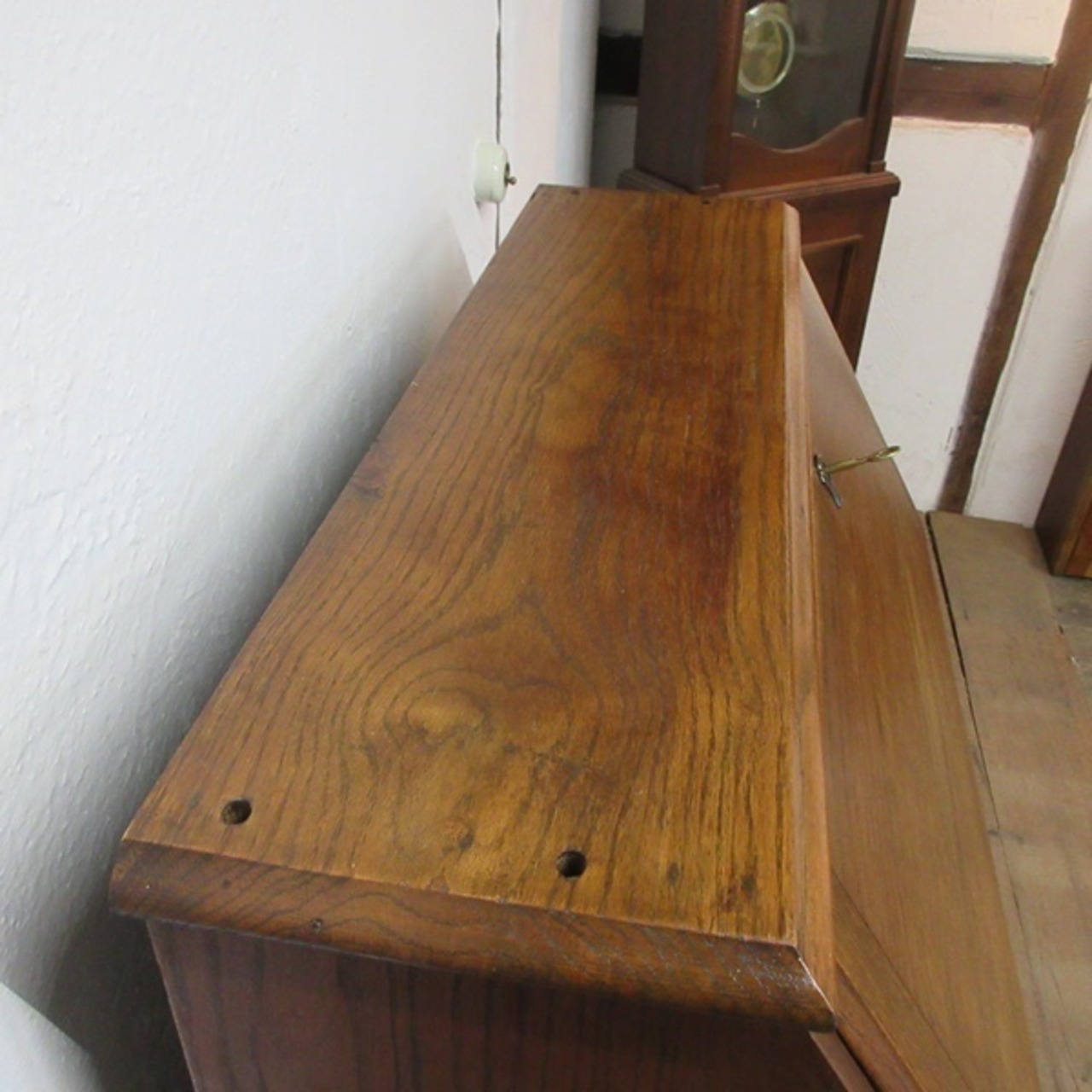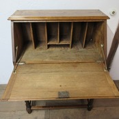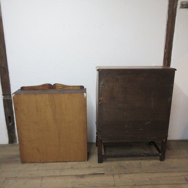 ビューロー内に染み・ステーの変形がございます。つまみにカケがございます。ビューロー部分の背面中ほどは中の板が元々出っ張っていることにより、割れやふくらみがございます。
