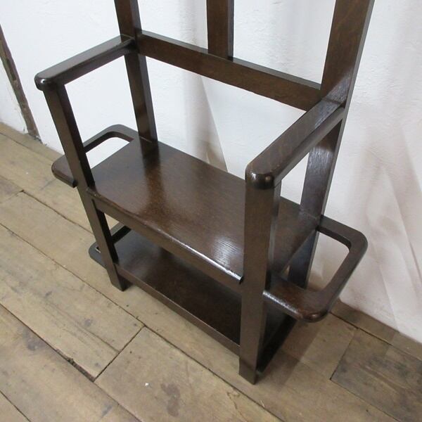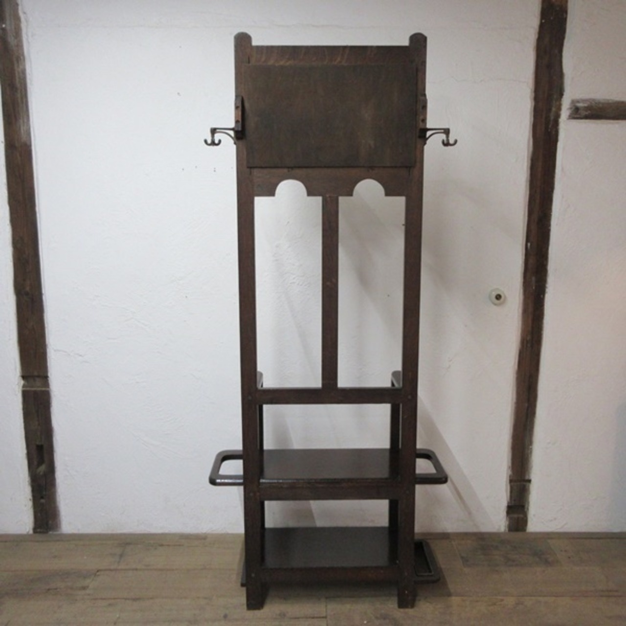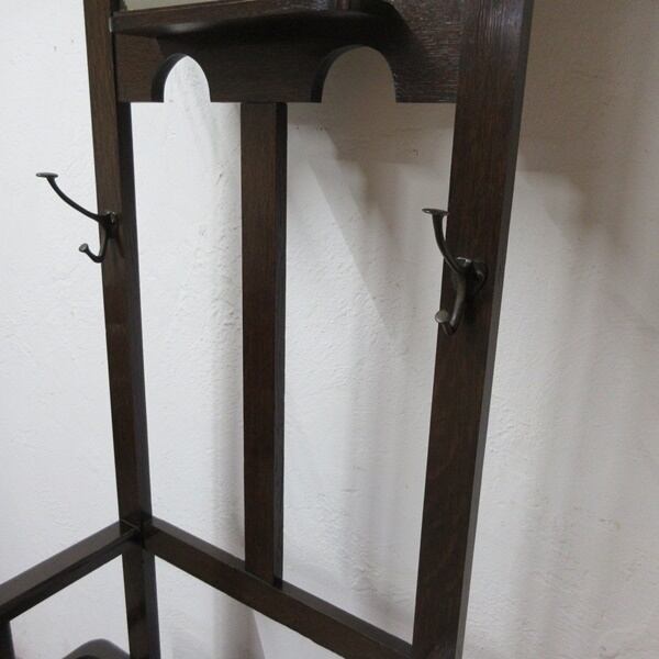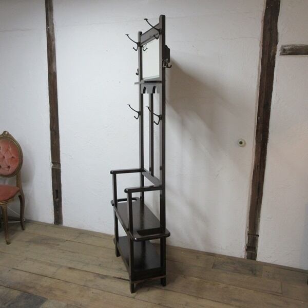 アイアンのフックが正面に4個、回転式フックがサイドに2個付属し、下方には靴を履くときなどにちょっと腰を掛けるスペースもあり便利にお使いいただけます。残念ながら右側面下方の傘受け枠と傘受けが欠損しておりますでの、訳ありでの出品とさせていただきます。