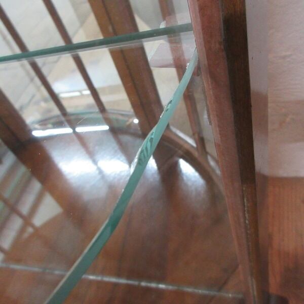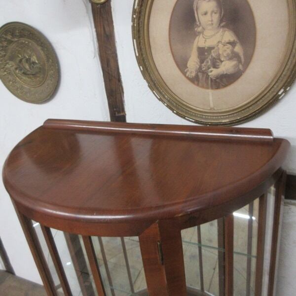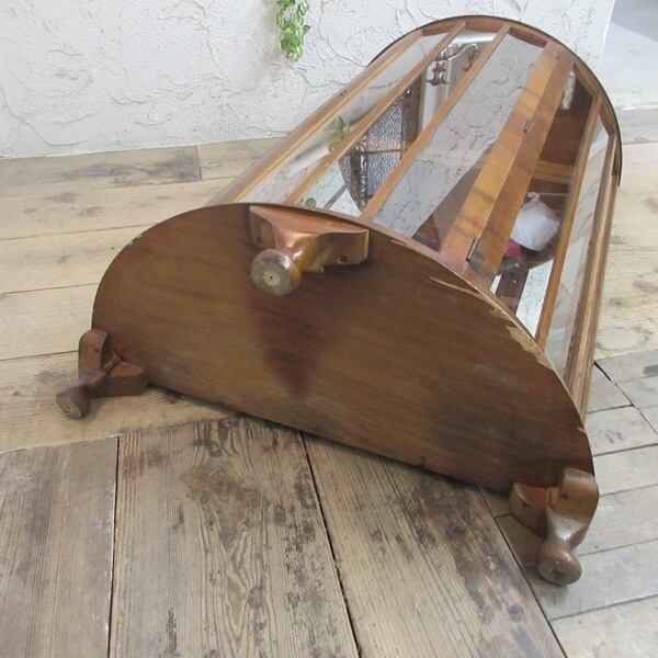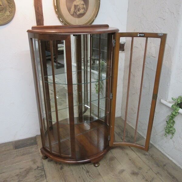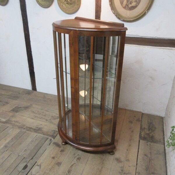 ミラーバックのガラスキャビネット。猫脚3本のハーフムーン形でエレガントなデザインのお品です。