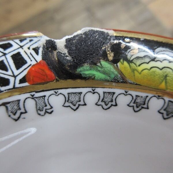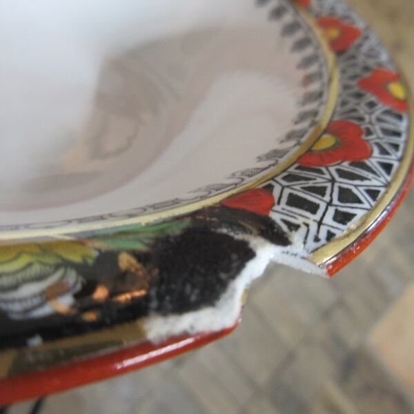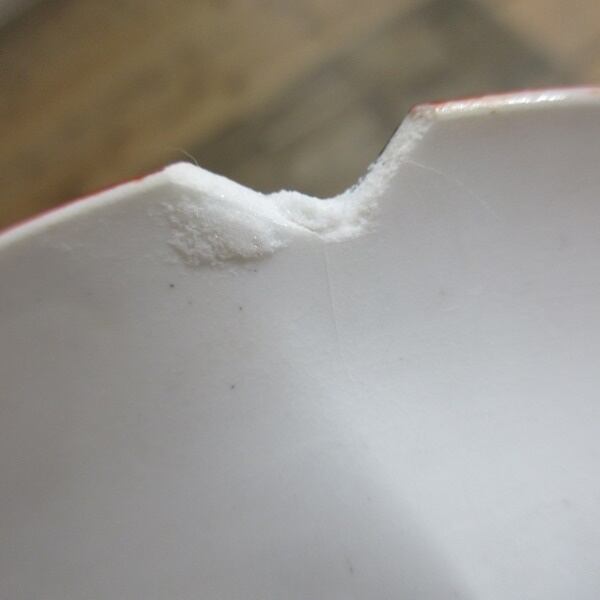 大きなカケ、カケがございます。カケの部分に補修跡のような跡がございます。気になる方はご注文をお控え下さい。