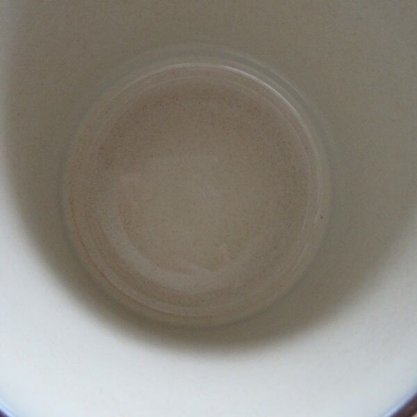 ダークブラウンの陶器にクリーム色の釉薬がかかり、ムギナデシコの絵柄が入っています。
