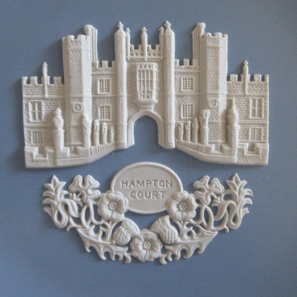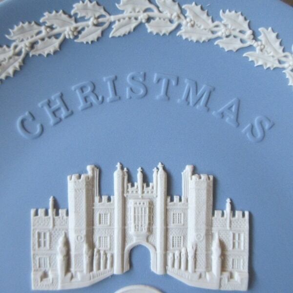 ウェッジウッドのクリスマスプレートは、ロンドンまたはロンドン近郊の有名なランドマークの細かくモデル化された白いジャスパーの浅浮き彫りで飾られています。1976年の記念プレートで、ロンドンのハンプトンコート宮殿がデザインされています。
