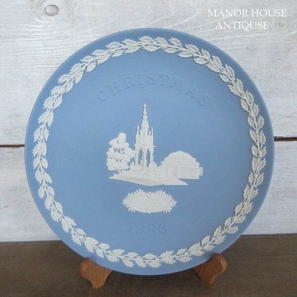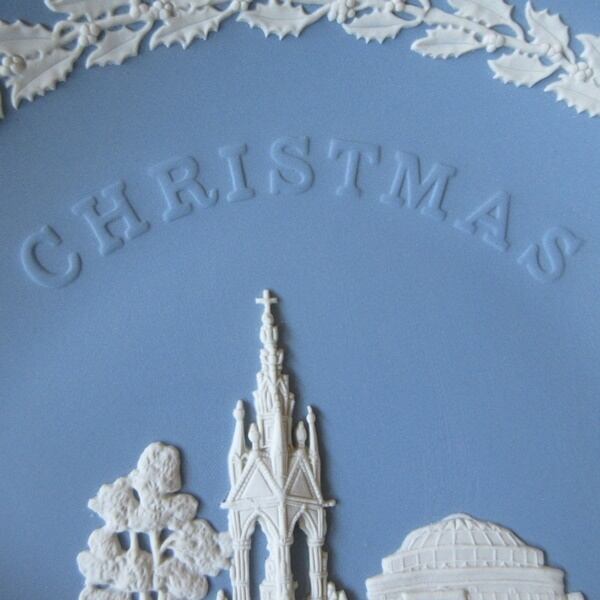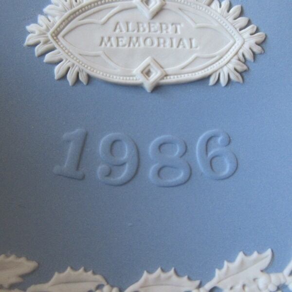 ウェッジウッドのクリスマスプレートは、ロンドンまたはロンドン近郊の有名なランドマークの細かくモデル化された白いジャスパーの浅浮き彫りで飾られています。1986年の記念プレートで、ロンドンのアルバート記念碑がデザインされています。