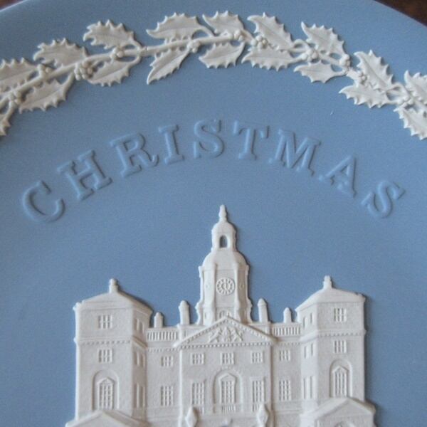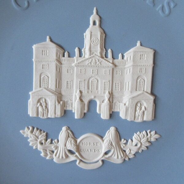 ウェッジウッドのクリスマスプレートは、ロンドンまたはロンドン近郊の有名なランドマークの細かくモデル化された白いジャスパーの浅浮き彫りで飾られています。1978年の記念プレートで、ロンドンのホワイトホールとホース・ガーズ・パレードの間に存在するパラディオ様式の建物、ホース・ガーズがデザインされています。