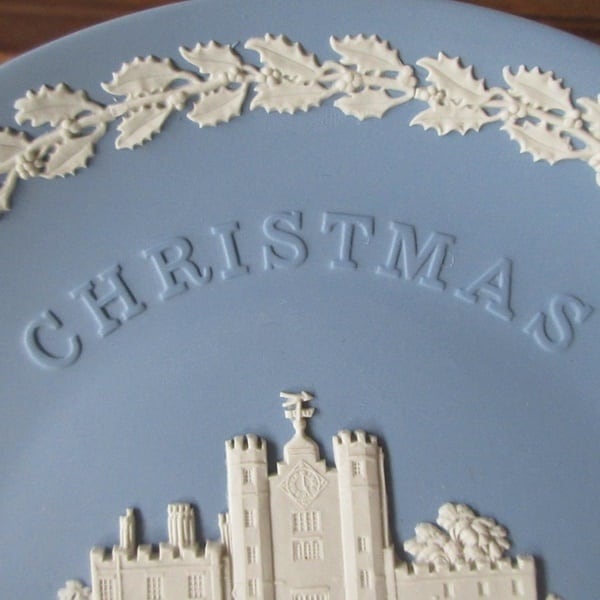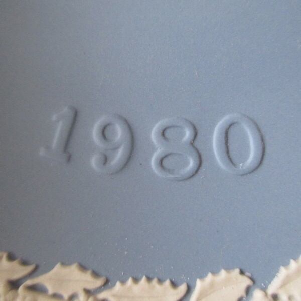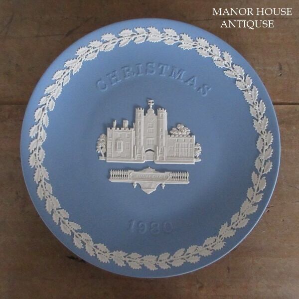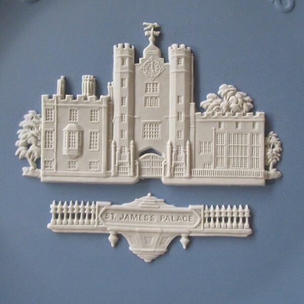 ウェッジウッドのクリスマスプレートは、ロンドンまたはロンドン近郊の有名なランドマークの細かくモデル化された白いジャスパーの浅浮き彫りで飾られています。1980年の記念プレートで、ロンドンのセント・ジェームズ宮殿がデザインされています。