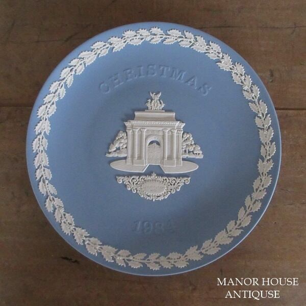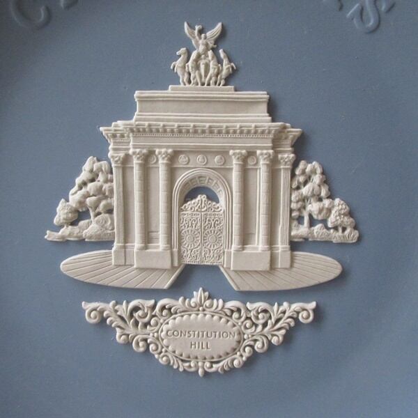 ウェッジウッドのクリスマスプレートは、ロンドンまたはロンドン近郊の有名なランドマークの細かくモデル化された白いジャスパーの浅浮き彫りで飾られています。1984年の記念プレートで、ロンドンのウェストミンスター市にある道路、コンスティテューションヒルにあるウェリントン・アーチがデザインされています。