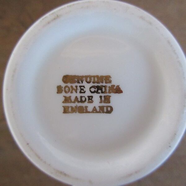GENUINE BONE CHINA MADE IN ENGLANDとバックスタンプがございます。ボーンチャイナとは、陶器や磁器のような、やきものの種類の一つで、「牛の骨(こっかい)」を混ぜて作られるやきものです。そのためボーンチャイナは、骨灰(こっかい)磁器ともいいます。GENUINE とは、純正という意味です。