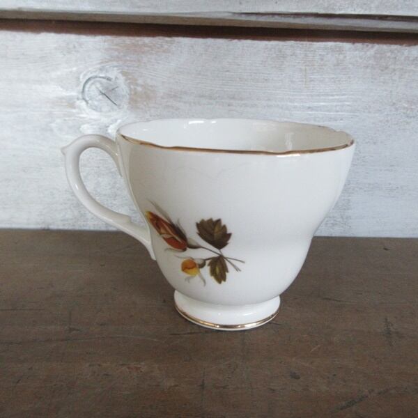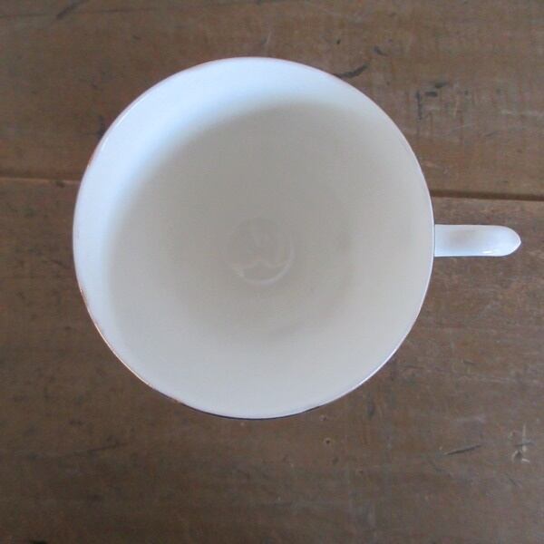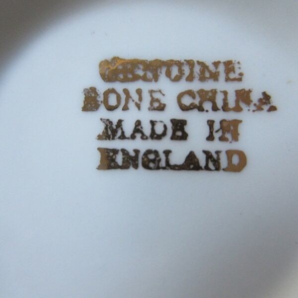 GENUINE BONE CHINA MADE IN ENGLANDとバックスタンプがございます。ボーンチャイナとは、陶器や磁器のような、やきものの種類の一つで、「牛の骨(こっかい)」を混ぜて作られるやきものです。そのためボーンチャイナは、骨灰(こっかい)磁器ともいいます。GENUINE とは、純正という意味です。