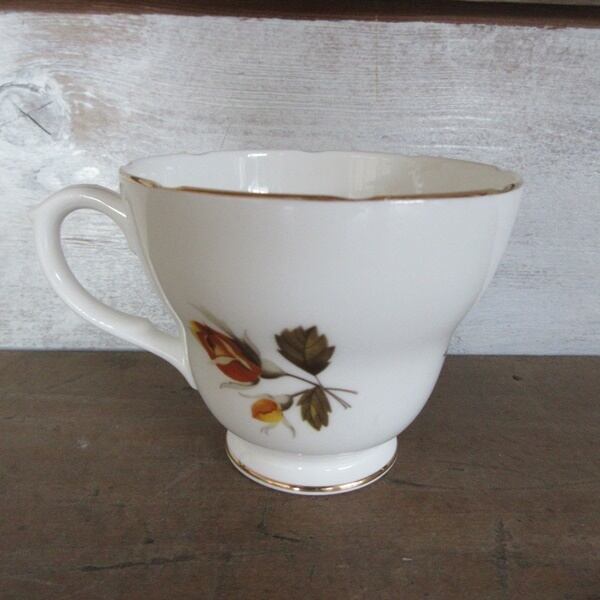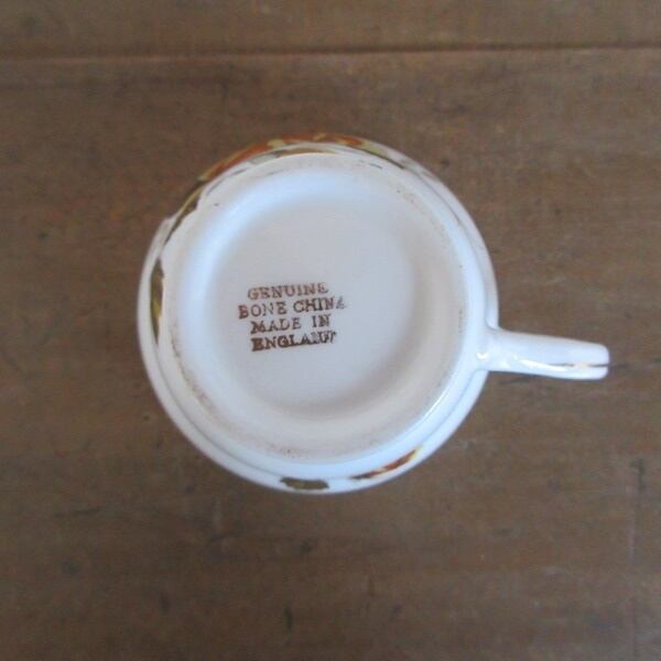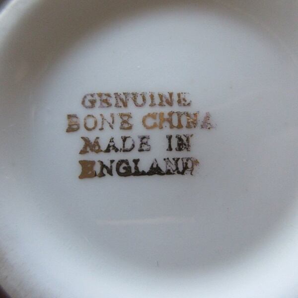 GENUINE BONE CHINA MADE IN ENGLANDとバックスタンプがございます。ボーンチャイナとは、陶器や磁器のような、やきものの種類の一つで、「牛の骨(こっかい)」を混ぜて作られるやきものです。そのためボーンチャイナは、骨灰(こっかい)磁器ともいいます。GENUINE とは、純正という意味です。