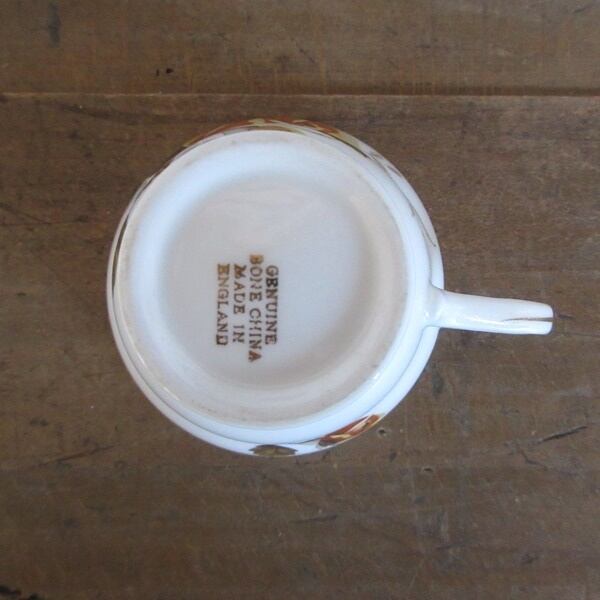 GENUINE BONE CHINA MADE IN ENGLANDとバックスタンプがございます。ボーンチャイナとは、陶器や磁器のような、やきものの種類の一つで、「牛の骨(こっかい)」を混ぜて作られるやきものです。そのためボーンチャイナは、骨灰(こっかい)磁器ともいいます。GENUINE とは、純正という意味です。