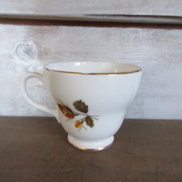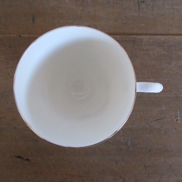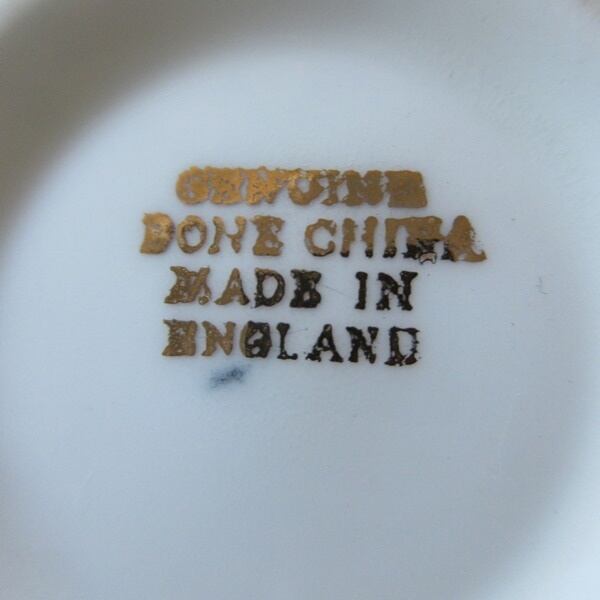 GENUINE BONE CHINA MADE IN ENGLANDとバックスタンプがございます。ボーンチャイナとは、陶器や磁器のような、やきものの種類の一つで、「牛の骨(こっかい)」を混ぜて作られるやきものです。そのためボーンチャイナは、骨灰(こっかい)磁器ともいいます。GENUINE とは、純正という意味です。
