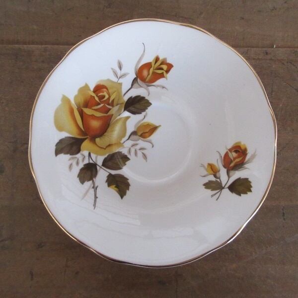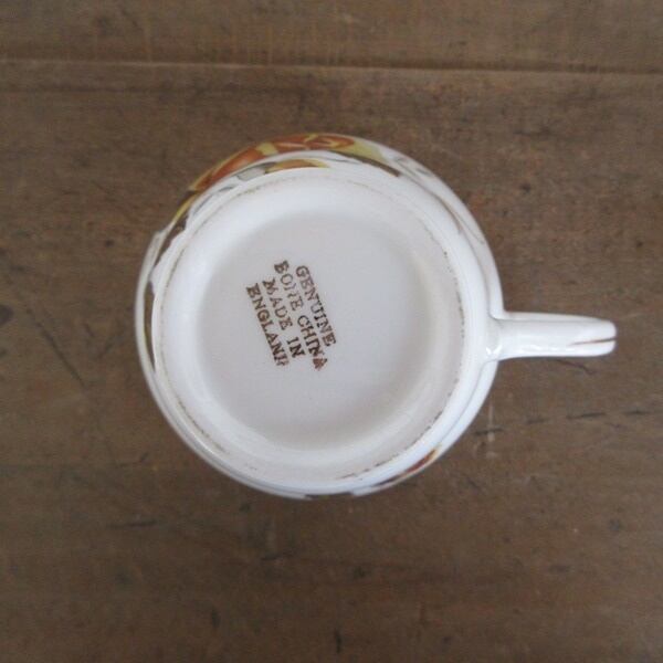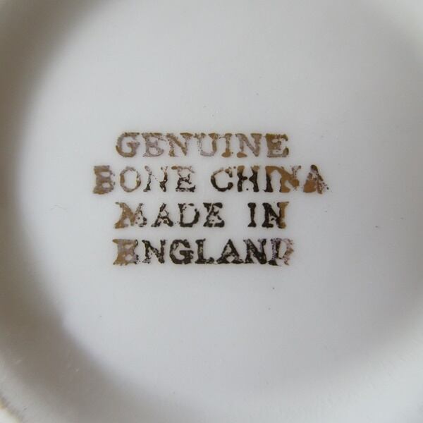 GENUINE BONE CHINA MADE IN ENGLANDとバックスタンプがございます。ボーンチャイナとは、陶器や磁器のような、やきものの種類の一つで、「牛の骨(こっかい)」を混ぜて作られるやきものです。そのためボーンチャイナは、骨灰(こっかい)磁器ともいいます。GENUINE とは、純正という意味です。