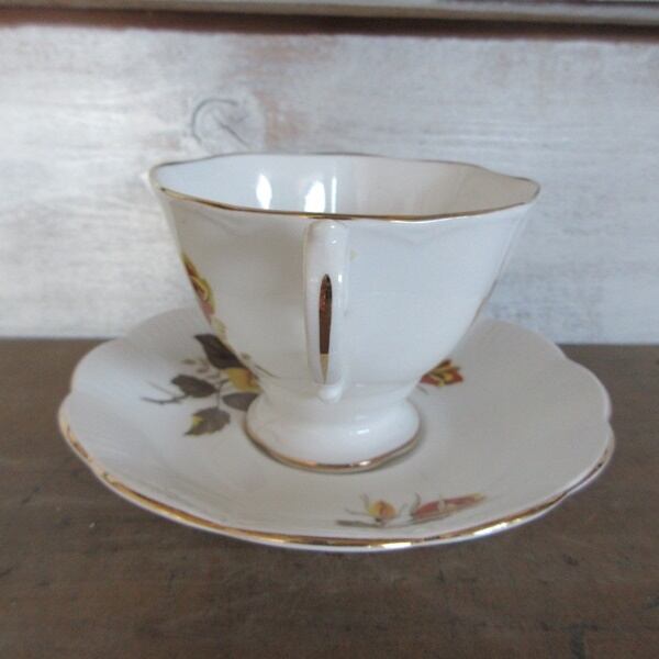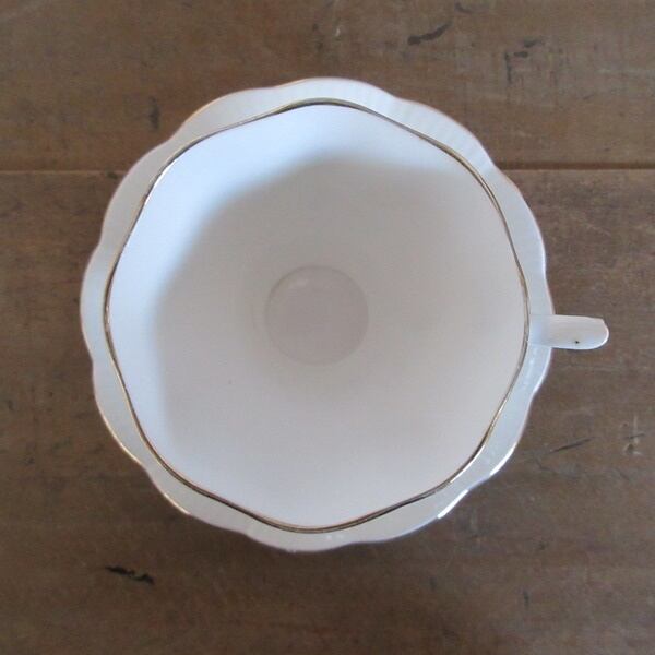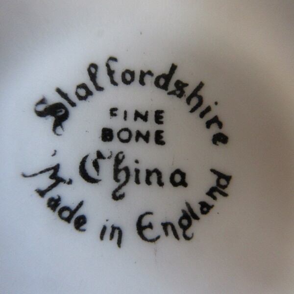 Staffordshire FINE BONE CHINA MADE IN ENGLANDとバックスタンプがございます。ボーンチャイナとは、陶器や磁器のような、やきものの種類の一つで、「牛の骨(こっかい)」を混ぜて作られるやきものです。そのためボーンチャイナは、骨灰(こっかい)磁器ともいいます。