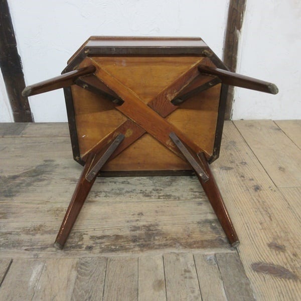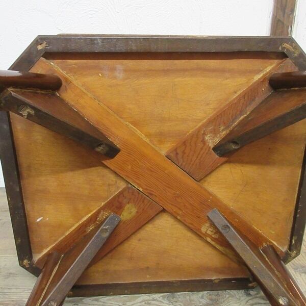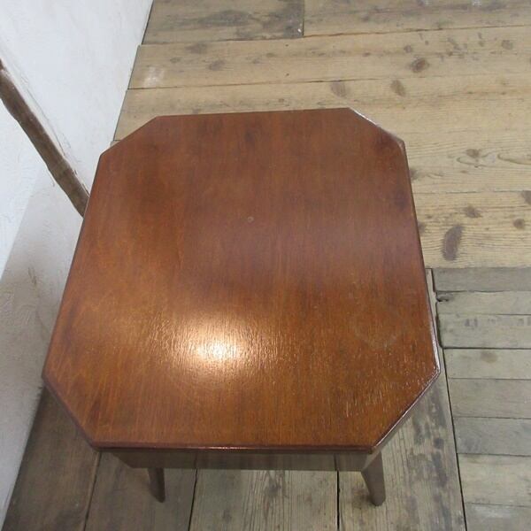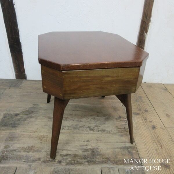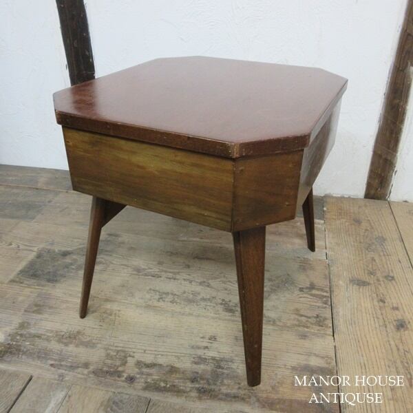 シンプルなデザインながらレトロで趣があるお品です。天板はスライド式で開き、どちらにも回転いたします。普段はコーヒーテーブルとしてもお使いいただけて便利ですね。