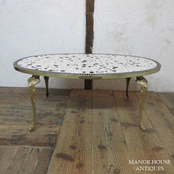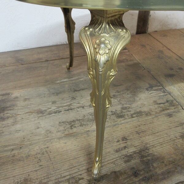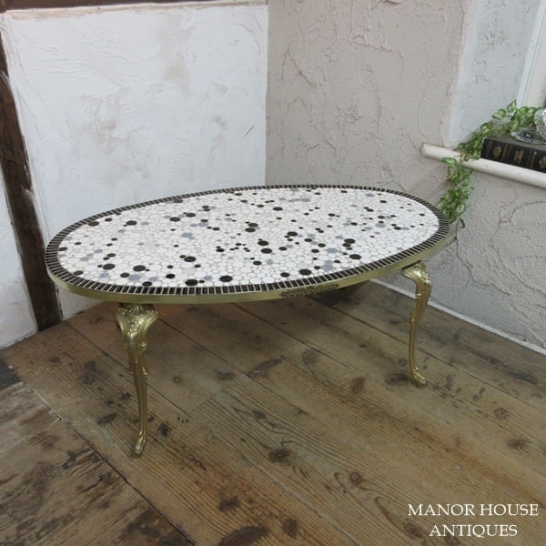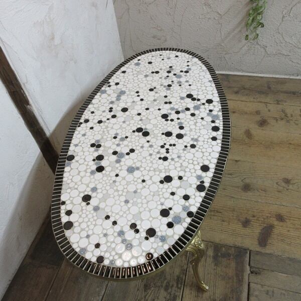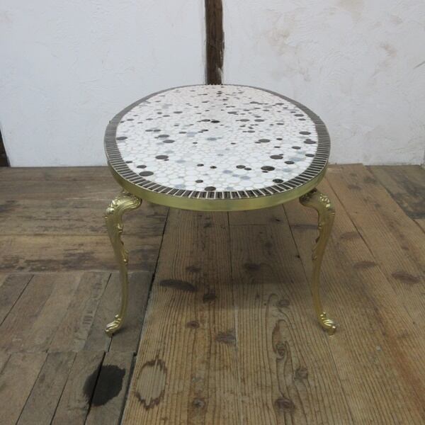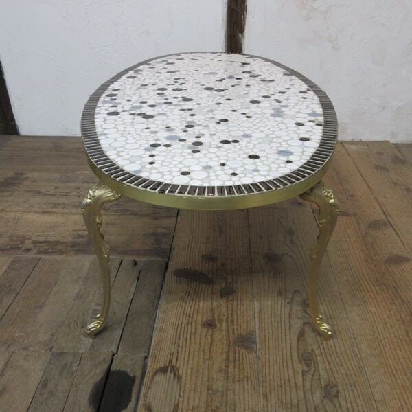 タイルの天板が珍しい。木製と違い輪染みにならないのでプランツテーブルとしてお使いいただいても良いかも知れません。脚はエレガントなデザイン。天板縁の真鍮の飾りもアクセントになって素敵です。