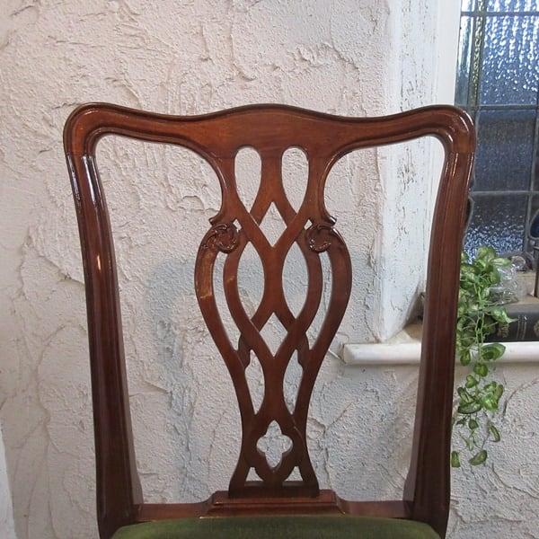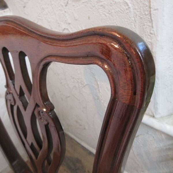 【チッペンデール様式】…チッペンデール様式の家具は特に椅子の意匠に特色があり、マホガニー材や開放式の背、花柄を主とした座面生地等を採用した、軽快かつモダンな意匠を展開します。背もたれの意匠は大きく3種に分けられます。なお、椅子の後ろ脚は大半が後ろに反る先細り形で、ゴシック風の場合は垂直の背にゴシックアーチが付きます。